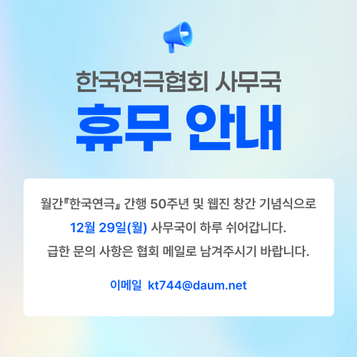 사이트맵 협회소개 -인사말 -협회개요 -협회연혁 -역대이사장 현황 -조직도 -오시는길 사업안내 -대한민국연극제 현황 -대한민국청소년연극제 -K-Theater Awards -대한민국시민연극제 -늘푸른연극제 일정 및 공연소식 -일정 및 공연소식 지회&지부 -회원커뮤니티 자료실 -행정서식 · 정관 · 협회서식 · 협회사업서식 -대한민국연극제 공연영상 -연극상 관련 수상자 명단 커뮤니티 -공지사항 -채용정보 -Q & A -문화예술계소식 · 문화예술계소식 · 공연소식 · 기타 및 모집 월간 한국연극 -월간 한국연극 -과월호 데이터 검색