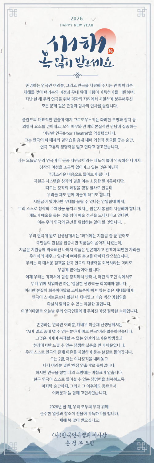 사이트맵 협회소개 -인사말 -협회개요 -협회연혁 -역대이사장 현황 -조직도 -오시는길 사업안내 -대한민국연극제 현황 -대한민국청소년연극제 -K-Theater Awards -대한민국시민연극제 -늘푸른연극제 일정 및 공연소식 -일정 및 공연소식 지회&지부 -회원커뮤니티 자료실 -행정서식 · 정관 · 협회서식 · 협회사업서식 -대한민국연극제 공연영상 -연극상 관련 수상자 명단 커뮤니티 -공지사항 -채용정보 -Q & A -문화예술계소식 · 문화예술계소식 · 공연소식 · 기타 및 모집 월간 한국연극 -월간 한국연극 -과월호 데이터 검색