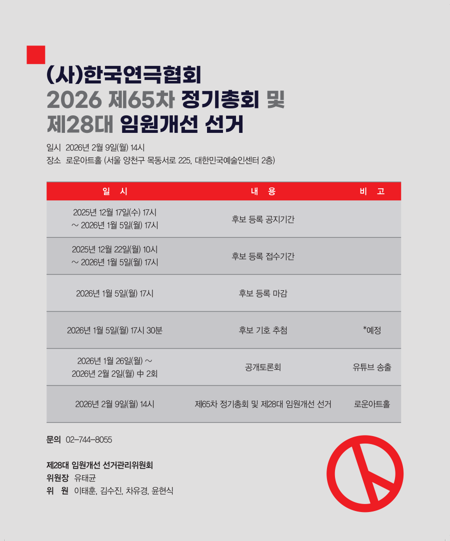 사이트맵 협회소개 -인사말 -협회개요 -협회연혁 -역대이사장 현황 -조직도 -오시는길 사업안내 -대한민국연극제 현황 -대한민국청소년연극제 -K-Theater Awards -대한민국시민연극제 -늘푸른연극제 일정 및 공연소식 -일정 및 공연소식 지회&지부 -회원커뮤니티 자료실 -행정서식 · 정관 · 협회서식 · 협회사업서식 -대한민국연극제 공연영상 -연극상 관련 수상자 명단 커뮤니티 -공지사항 -채용정보 -Q & A -문화예술계소식 · 문화예술계소식 · 공연소식 · 기타 및 모집 월간 한국연극 -월간 한국연극 -과월호 데이터 검색