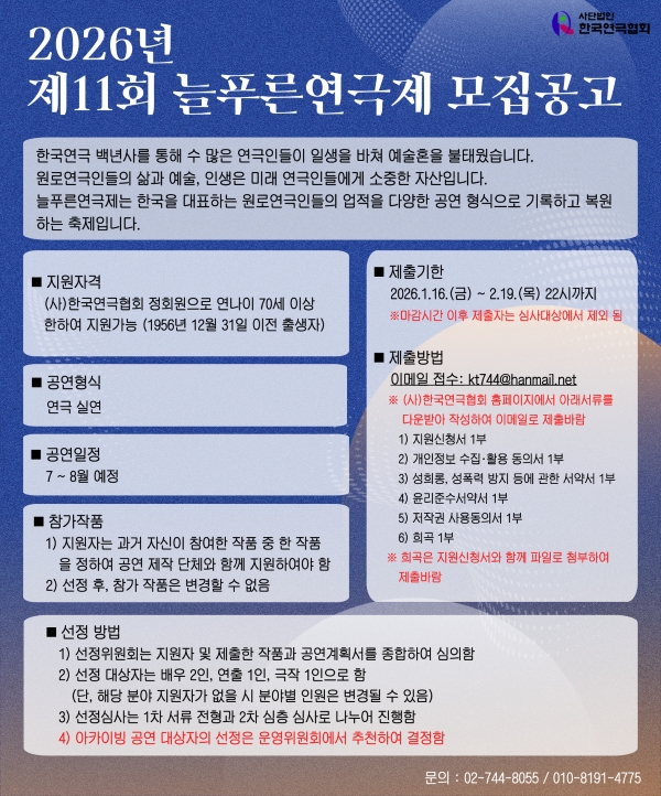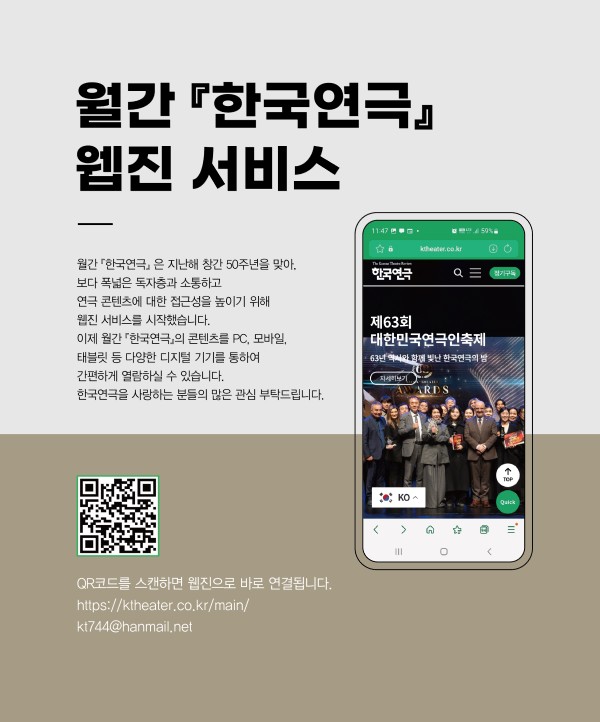 사이트맵 협회소개 -인사말 -협회개요 -협회연혁 -역대이사장 현황 -조직도 -오시는길 사업안내 -대한민국연극제 현황 -대한민국청소년연극제 -K-Theater Awards -대한민국시민연극제 -늘푸른연극제 일정 및 공연소식 -일정 및 공연소식 지회&지부 -회원커뮤니티 자료실 -행정서식 · 정관 · 협회서식 · 협회사업서식 -대한민국연극제 공연영상 -연극상 관련 수상자 명단 커뮤니티 -공지사항 -채용정보 -Q & A -문화예술계소식 · 문화예술계소식 · 공연소식 · 기타 및 모집 월간 한국연극 -월간 한국연극 -과월호 데이터 검색