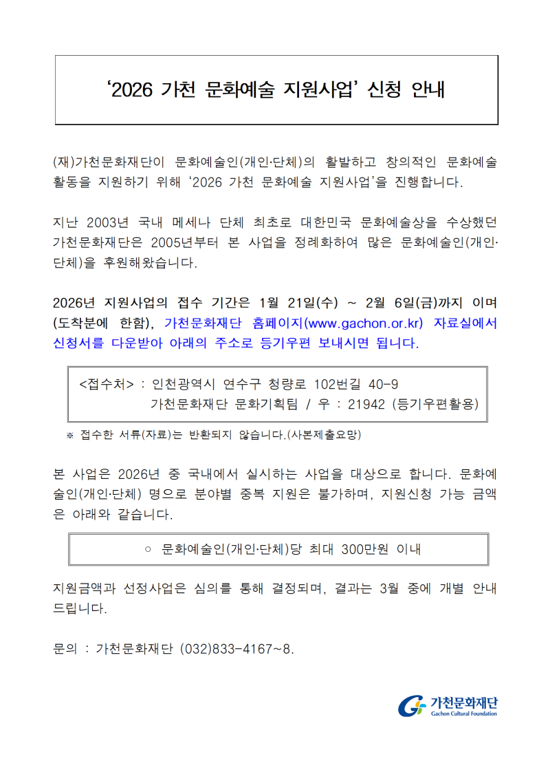 | 제목 | [가천문화재단] 2026 가천 문화예술 지원사업 안내 | ||||||