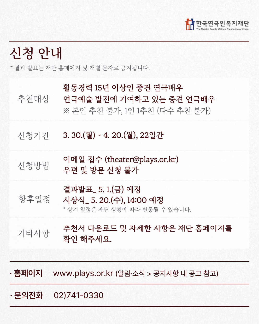 제목 [한국연극인복지재단] 2026 연복 연기상 후보자 추천 및 연극 스태프상 신청 공고 홍보