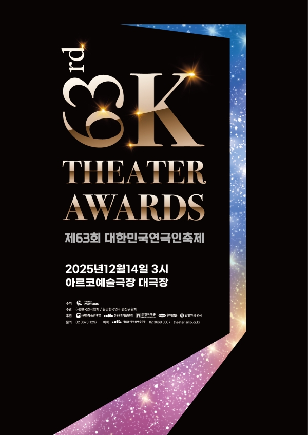 - 행사명: 제63회 대한민국연극인의밤 K-Theater Awards - 일 시: 2025. 12. 14. (일) 오후 3시 - 장 소: 아르코예술극장 대극장 - 가 격: 전석 무료석 - 주 최: 사단법인 한국연극협회 - 주 관: 사단법인 한국연극협회, 월간『한국연극』 편집위원회 - 후 원: 문화체육관광부, 한국문화예술위원회, (사)한국예술문화단체총연합회, 한미약품(주), 동방인쇄공사 - 문 의: 02-765-6995