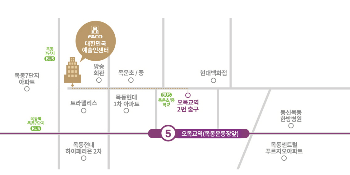 4. 찾아오는 길 주 소 _ 서울시 양천구 목동서로 225, 대한민국예술인센터 2층 대중교통 _ 지하철 5호선 오목교역 2번 출구 도보 5분 버 스 목동7단지·종로학원 정류장 640번 650번, 5012번, 5616번, 6211번, 6628번, 6630번 목운초·중학교 정류장 603번, 6624번, 6637번, 6638번, 700번, 98번