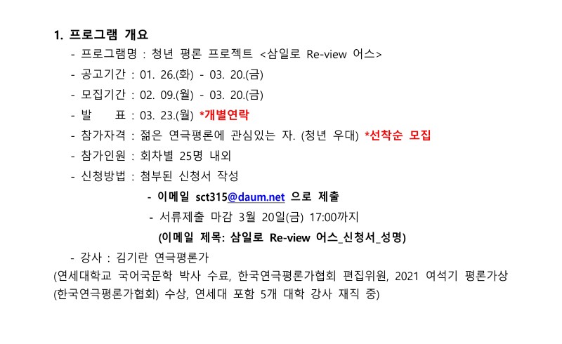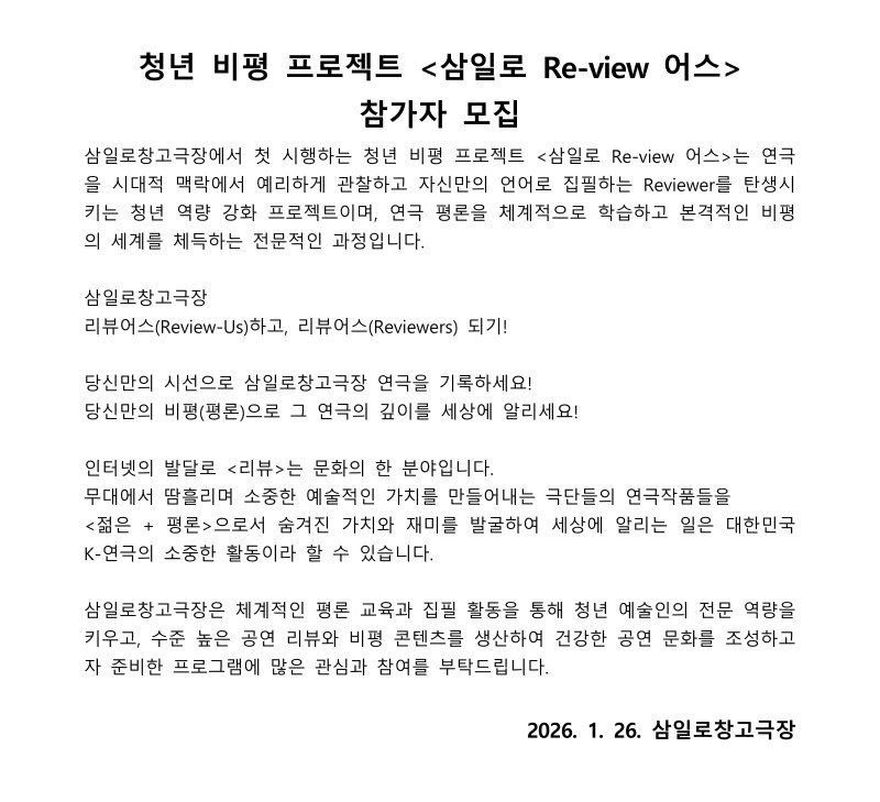 제목 [공지] [삼일로창고극장] 청년 비평 프로젝트 <삼일로 Re-view 어스> 참가자 모집
