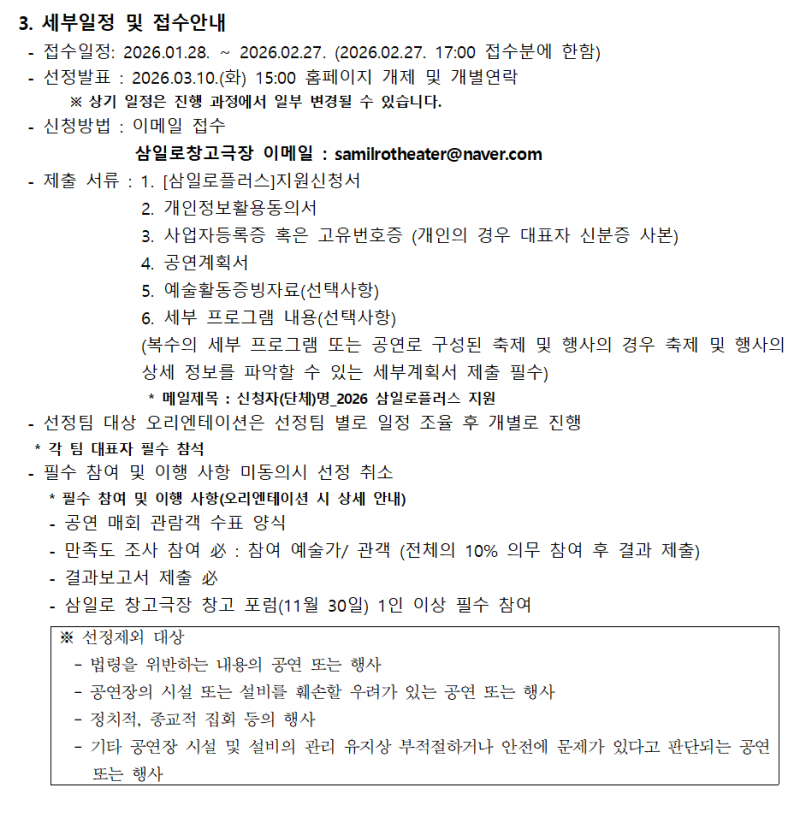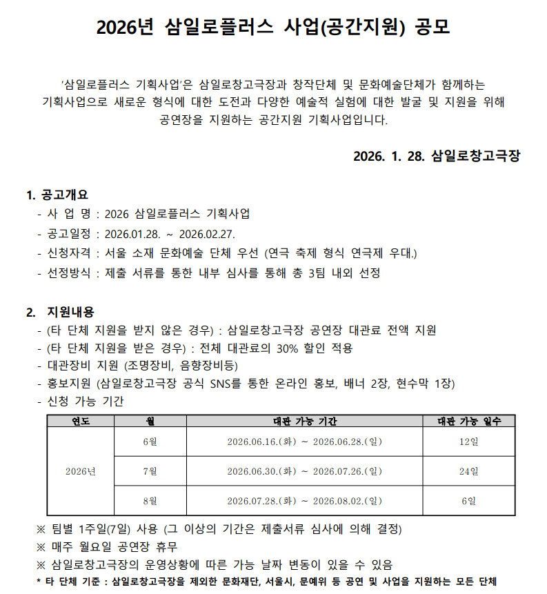 제목 [공지] [삼일로창고극장] 2026년 삼일로플러스 사업(공간지원) 공모