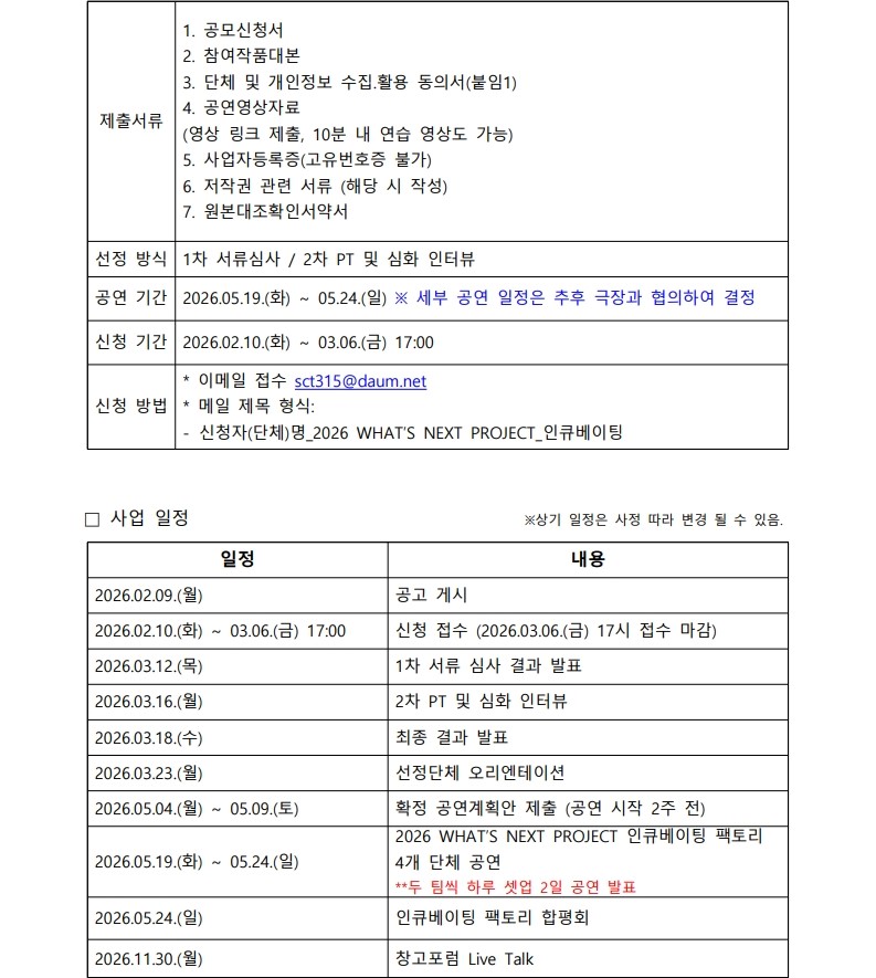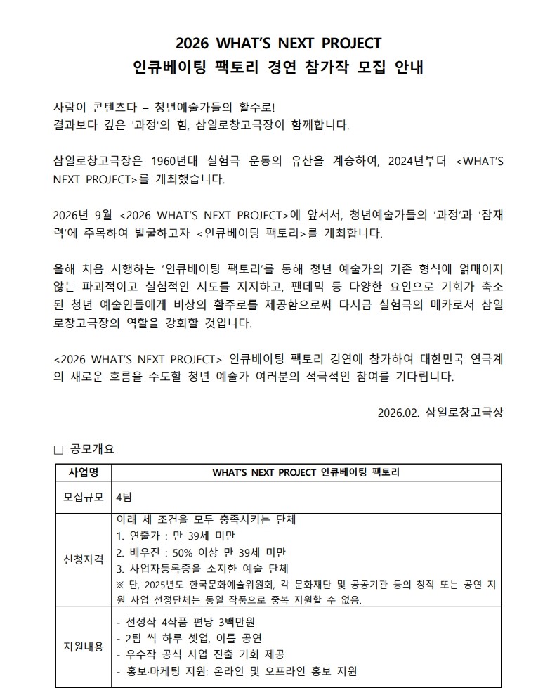 제목 [공지] [삼일로창고극장] 2026 WHAT\'S NEXT PROJECT 인큐베이팅 팩토리 공모
