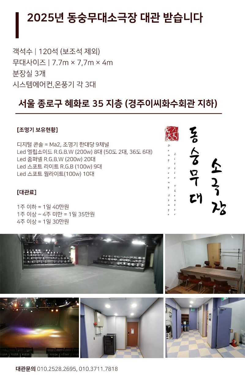 제목 새롭게 단장한 동숭무대소극장 대관신청 받습니다. 많은관심을 꼭!! 부탁드려요~~^^