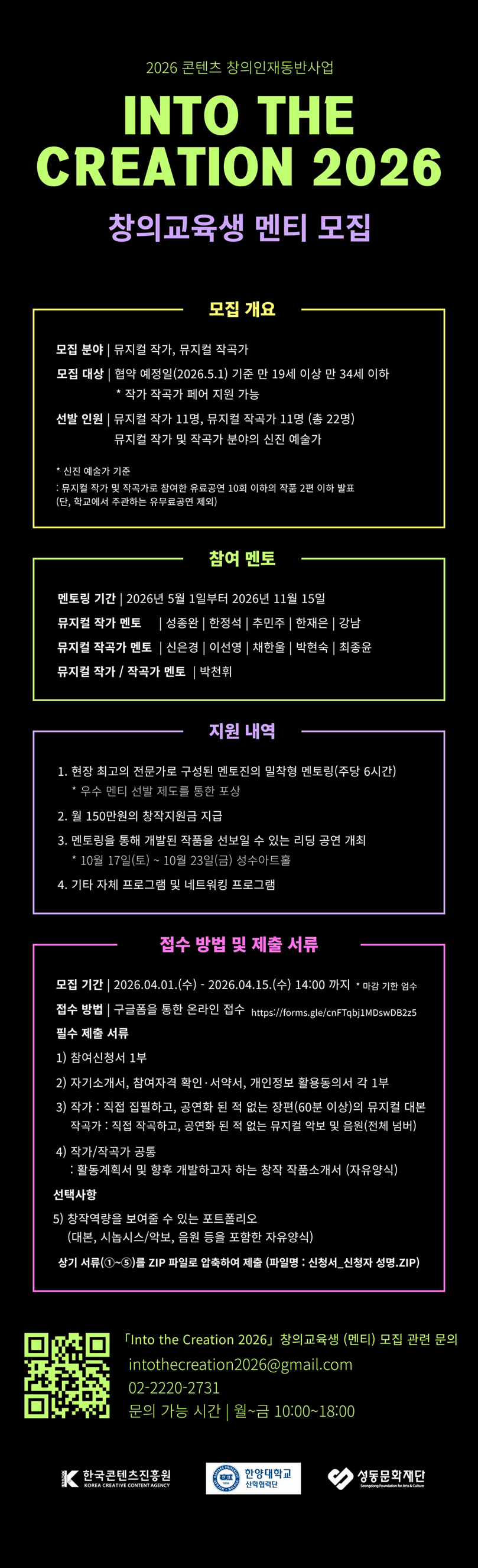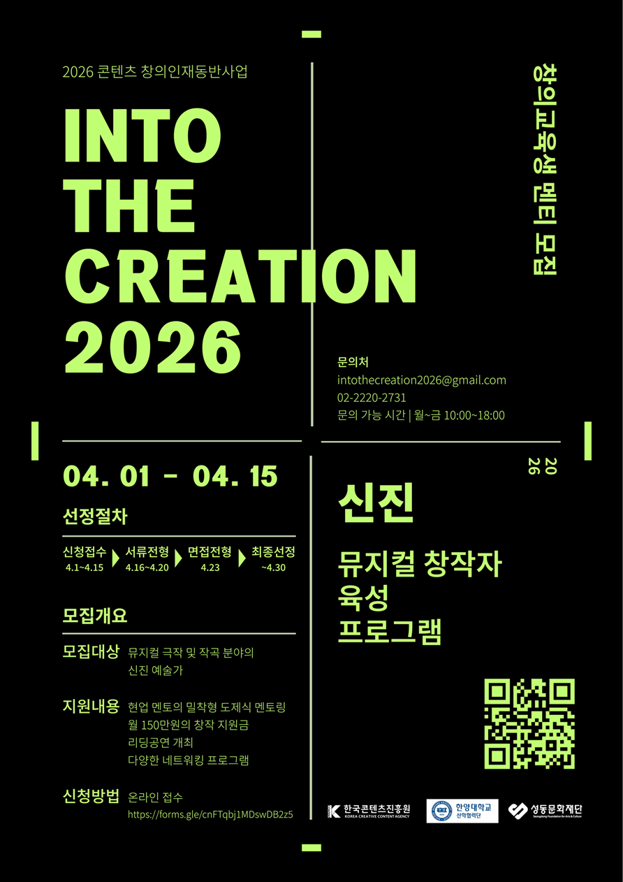 한국콘텐츠진흥원과 '한양대학교 산학협력단' / '(재)성동문화재단'은 콘텐츠 산업의 경쟁력 있는 창작자 육성을 위해 콘텐츠 창의인재동반사업의 교육생(멘티)을 모집합니다. 현장전문가(멘토)의 멘토링이 지원되는 콘텐츠 창의인재동반사업에 참여할 열정과 재능을 지닌 창작자 여러분의 많은 관심과 도전 바랍니다. ㅇ 프로그램명: ㅇ 선발인원: 뮤지컬 작가 11명, 뮤지컬 작곡가 11명 (총 22명) ㅇ 멘토링 기간: 2026.5.1. ∼ 2026. 11. 15.(약 6.5개월) 예정 ㅇ 모집 공고 링크: http://hyu.ac/IntotheCreation ㅇ 문의: intothecreation2026@gmail.com / 02-2220-2731 (문의 가능 시간: 월~금 10:00~18:00) *지원 관련 상세 내용은 모집 공고 상의 첨부파일을 참고하세요. ![]() ![]() |