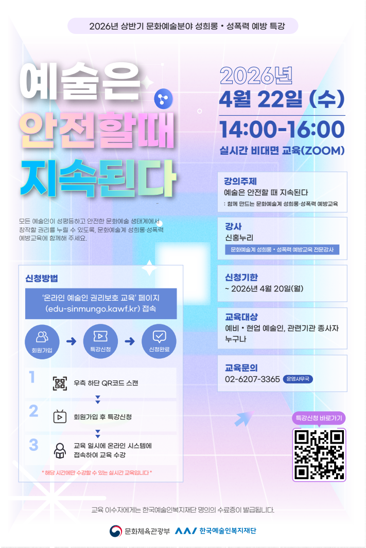 (신청 마감일: ~ 4. 20.(월)까지) ■ 교육 개요 - 교 육 명: 2026년 상반기 문화예술분야 성희롱·성폭력 예방 특강 - 강의 주제: 예술은 안전할 때 지속된다 | 함께 만드는 문화예술계 성희롱·성폭력 예방교육 - 교육 일시: 2026. 04. 22.(수) 14:00 ~ 16:00 - 주최·주관: 문화체육관광부·한국예술인복지재단 - 수 강 료: 무료